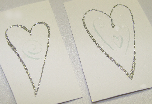 4) working carefully, apply WHITE FROST GLITTER to the heart designs in the border, only use a small amount of glitter, and press lightly. flip quickly upside down and tap off excess glitter.