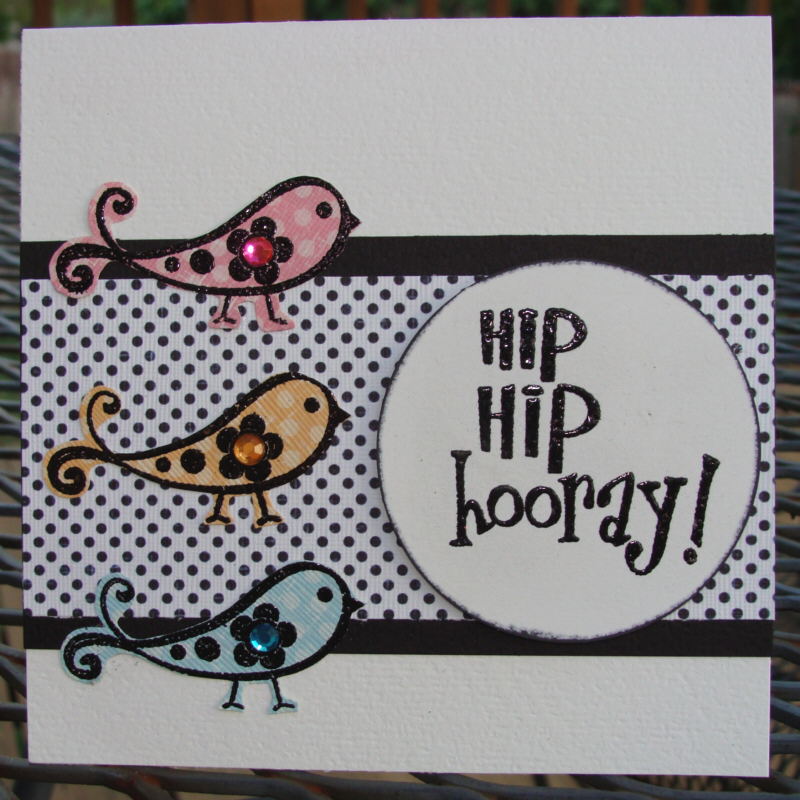4) stamp and emboss birds on pink, blue and yellow printed paper; cut out and adhere to card.