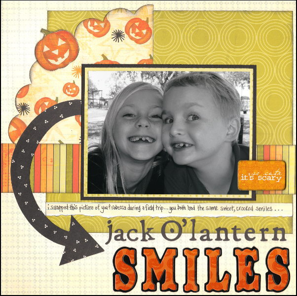 i used last years halloween line by scenic route – salem, and some older lil’ davis chipboard letters to add the smile title. i thought i’d do a little goodbye tribute to scenic route as they were one of my FAVORITE lines! i’m sad to see them go.