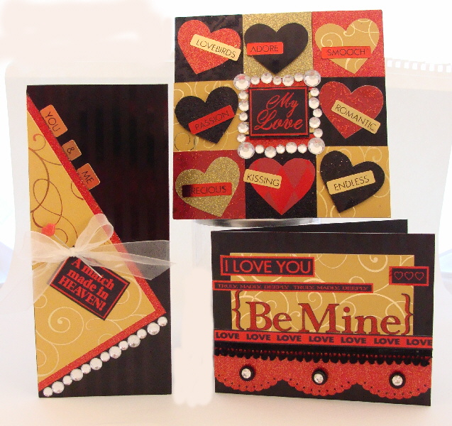 Reminisce included some fabulous embellies with this line – cute little love words to mix and match, beautiful foil cardstock stickers and strips. it made it easy to create these cards. i just added a little ribbon, trim and bling!