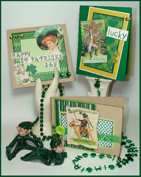 “st. pat forever” card: Reminisce: Lucky Me: Lucky Stripe and Micro Clover printed papers, Gecko Galz: Irish Eyes Ephemera, Clearsnap: ColorBox Chalk Ink: Chestnut Roan and Smooch Spritz: Spun Sugar, Bazzill: Pear Crush and Shamrock cardstock, Prism: Paper Bag cardstock, Darice: buttons, May Arts: ribbon and thin foam dots.