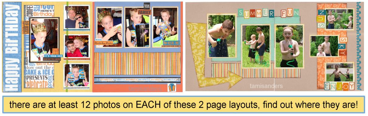 in this class you’ll get to make 2 – 2 page layout. each has a different technique to get MORE photos on your pages. the techniques are easy to learn and to do, so you’ll be able to incorporate them into your own layouts as well.