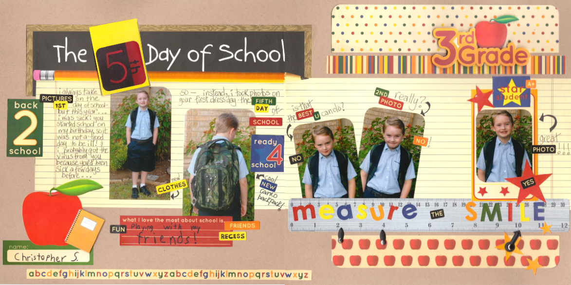 Oh sorry to hear that you were sick the first day of school and on your birthday no less! Love the layout and how you scrapped the 5th day. It will definitely be something to look back on. :)