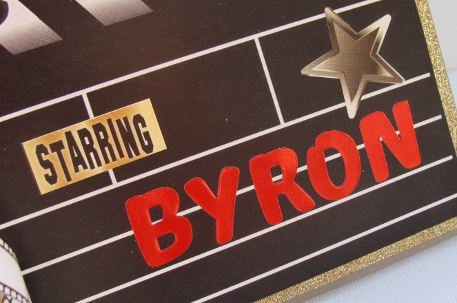 the swirl of filmstrip was made by adhering 2 of the film strip stickers from the HOLLYWOOD FOLDED QUOTE STICKER back to back, and then pulling the strip along the side of the table to make it curl. the strip was cut apart so that part of it could be adhered under the top portion of the glitter mat to extend up, and the longer part glued beneath the top strip and tacked to the front of the card to swirl down…