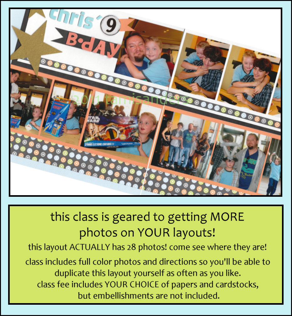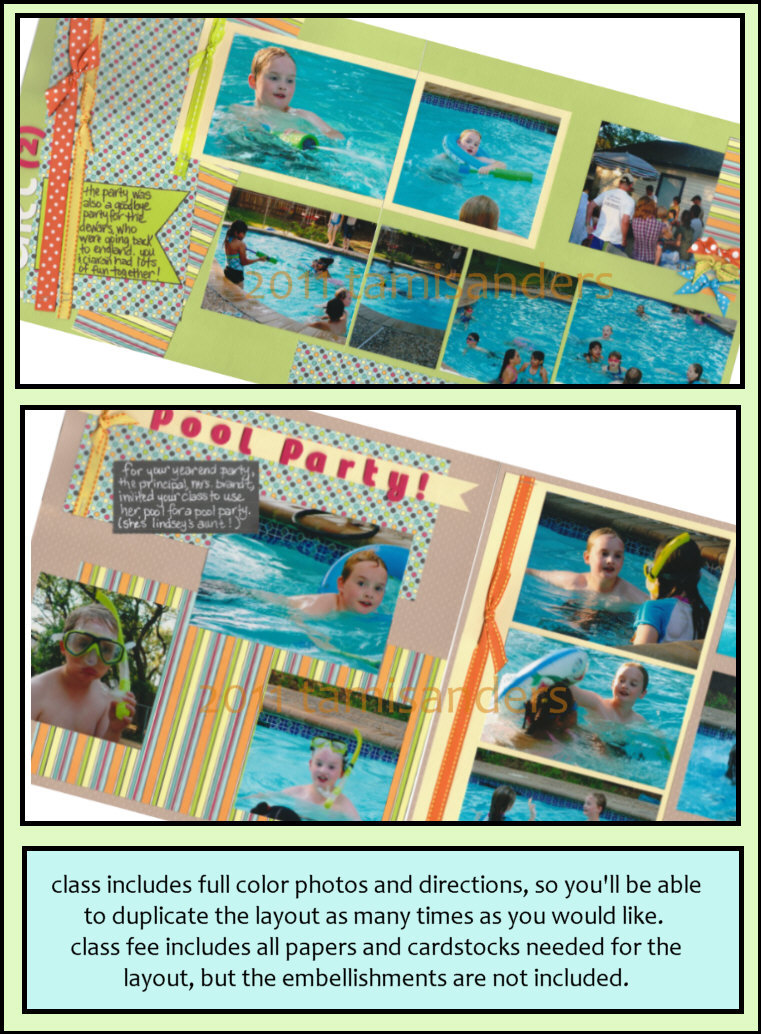 the fee for either of these classes is $15.00 and includes all the papers and cardstocks needed to make the layouts. {embellishments are not included}