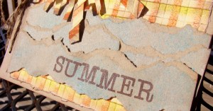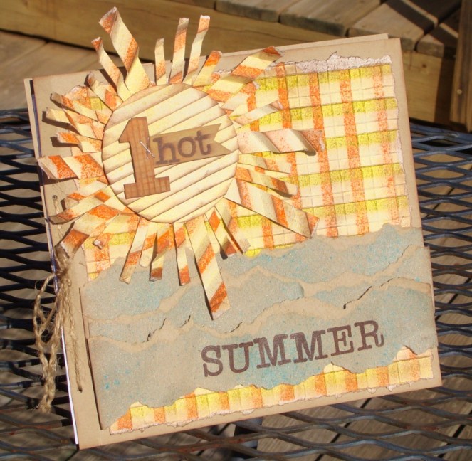 to embellish cover, tear plaid piece around all edges, and adhere to front. then adhere waves, using 3D Foam Squares to adhere “Summer” stamped piece at bottom. use 3D Foam Squares to adhere sun at upper left, then use more 3D Foam Squares to adhere “1 hot” at center of sun.