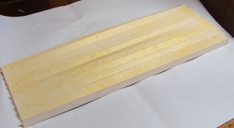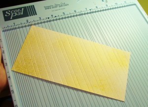 i thought it might be fun to try to make my own plaid paper using the Scor-Pal. so i first spritzed cardstock with some Gold Glow Smooch Spritz as a base color {i started with a 12 X 12 piece, then cropped to 8 X 8; reserve extra for use below}. and then to pleat, i scored the cardstock at 1/4″, then 3/4″, then 1″, then 1 1/2″, etc; this creates a pattern of 1/4″ sections separated by 1/2″ sections. when you pleat the paper, you’ll have sections that will be “hidden” when you spray on a second color and those areas will remain the base color…