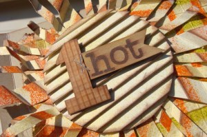 for the “1 hot”, i first scored a scrap piece of kraft paper at 1/8″ intervals both vertically and horizontally across, then i drew and cut out the “1”. it was then inked with Orange Pigment Ink, i also used a Stylus and a Blender Tip to apply a bit of Leather Mix’d Media Inx over it to bring out the creases. this same technique and ink was used to age and antique all the other pieces as well. the “hot” {My Sentiments Exactly: School Days Lower/Numbers} was stamped using the Leather Mix’d Media Inx and then, before it dried completely, i streaked on a bit of Marigold and Orange Pigment Inks, applied using the Stylus and a Blender Tip to create some “heat waves”…