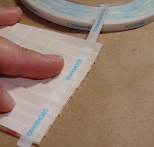to hold the pleats together while you spray the paper, use the Scor-Tape along the short sides. just apply a strip to each side, then remove the backing and stick the pleated paper to a piece of scrap paper {the tape will release easily by heating it a bit with a heat gun, or using undu}….