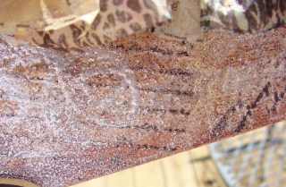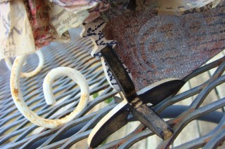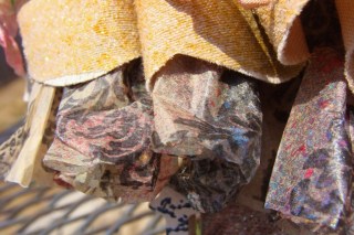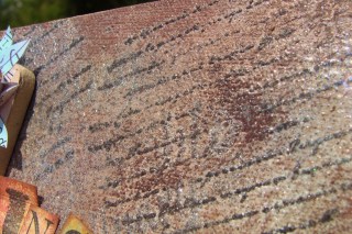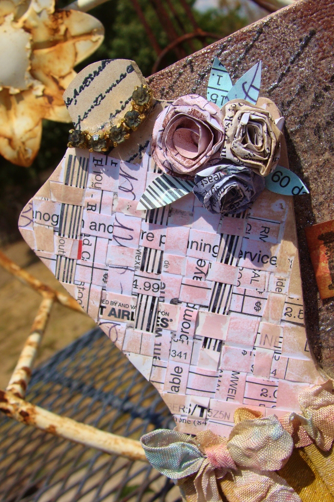 The body was covered with a woven piece that was made by cutting pieces of my black and white “souvenirs” into thin strips and weaving them together. The piece was fitted to the mannequin, then trimmed to fit. MixEd MEdiA iNX in Honey and Chiffon were rubbed on to add some color…