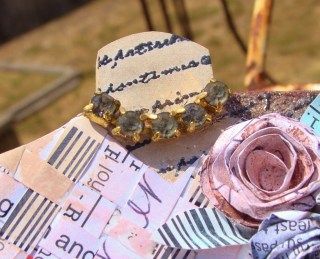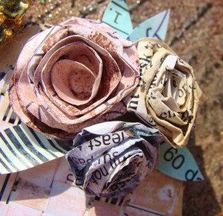 To further embellish the dress form, a vintage junque-jewelry rhinestone piece was adhered as a choker, and paper roses and leaves were made from more ticket and receipt pieces that had been tinted using Smooch Spritz. After they were formed, they were rubbed with MixEd MEdiA iNX in Honey…