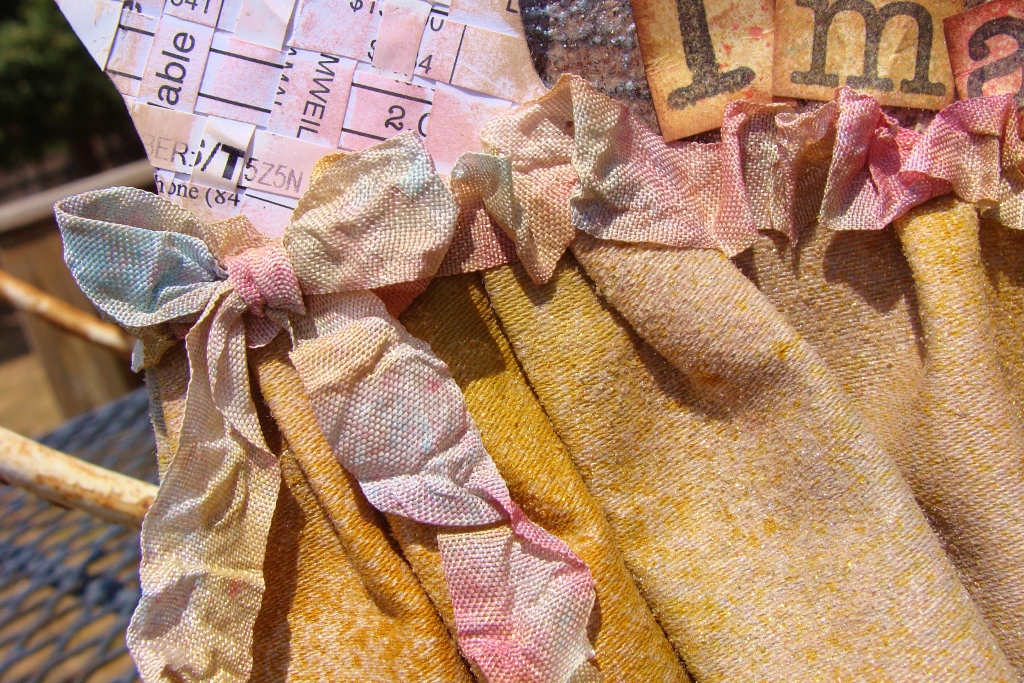 The ribbon trim was made by dyeing vintage seam binding using Smooch Spritz, then crumpling the ribbon tightly in a napkin while it was still wet. After the ribbon dried, it was adhered using Scor-Tape…