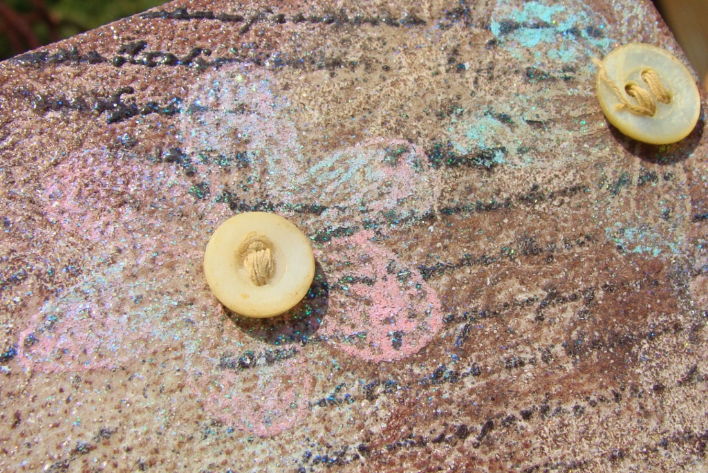 Circles of script were stamped in Black ink while the canvas was still “wet”, then, the entire piece was sprinkled with and embossed using Clear Embossing Powder. Scrolls and words were added and embossed in Sterling Silver. Finally, flowers were stamped using the MixEd MEdiA iNX and embosed in Opalescent Clear and finished with vintage button centers…