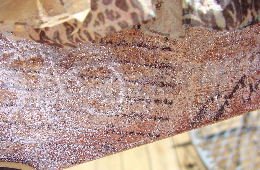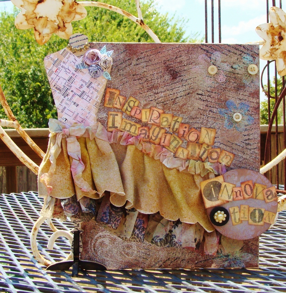 Since I plan to display this piece in my studio, the words chosen were my favorite “3 I’s of Crafting” — Inspiration, Imagination and Innovation. The words were made by stamping the letters in Wicked Black Dye Ink, with several different alphabet stamp sets, on a piece of file folder that had been bLinGeD up with Smooch Spritz . The letters were cut apart and slightly “crumpled”. Then they were distressed using Leather MixEd MEdiA iNX applied with a Stylus and Blender Tip…