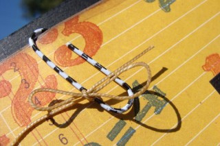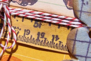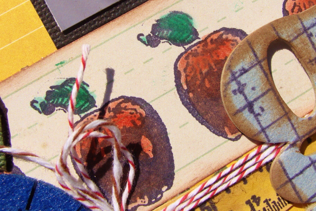 The first thing I reached for was my ColorBox Premium Dye Inks by Stephanie Barnard; they are bright, vivid and clear and would work well with the colors in the photo. The next things I gathered up were some school themed stamps; including the ABC Primer stamps. Black and kraft cardstocks would serve as a base; black to set off the photo and kraft to lend a vintage feel. Then I found a few patterned papers that would fit in with the layout. For embellishments, I noticed that some felt flowers by Epiphany Crafts matched perfectly with the background color of the photo. Baker’s twine in red and brown worked with the theme and colors as well.