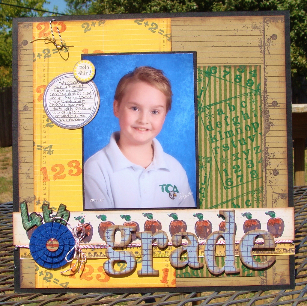 So, when Hampton Art released their new stamp sets for Graphic 45’s ABC Primer collection, I just had to have them. My son’s 4th grade school photos gave me the perfect chance to use them. But the photo was a little on the “bright” side to say the least, so it was a bit of a challenge to bring in the vintage touches I like but balance them with the crisp, primary colors in the photo.