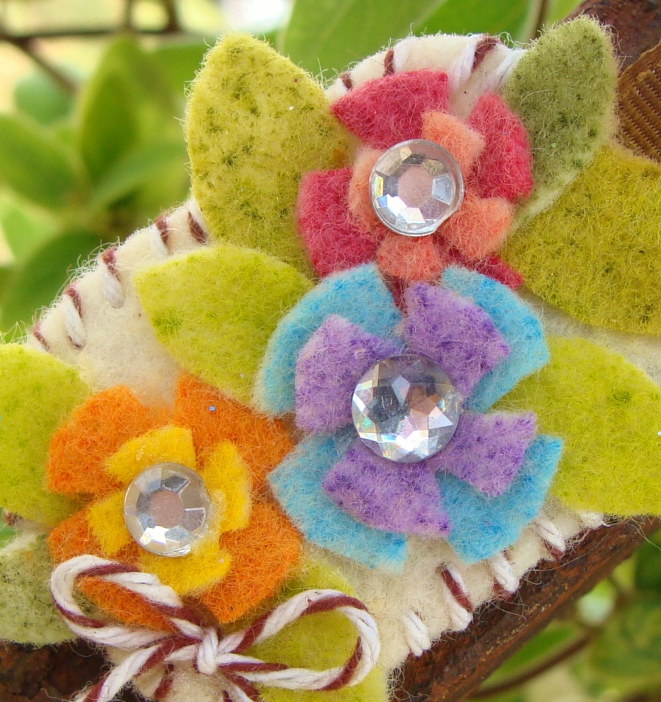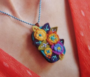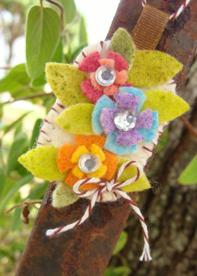 i started with ecru felt, and tinted it using Smooch Spritz to get a variety of colors instead of buying different colors of felt. i decided not to embroider the pieces, although i did love the vintage boho vibe the stitching gave the sample piece. and instead of machine stitching the pendant and pocket pieces together, i handstitched them with a whipstitch using baker’s twine. here are some closeup photos of the project…
