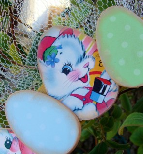 the Happy Easter 2012 line is done in pretty pastels with some adorable vintage images. i made this egg bedecked wreath…