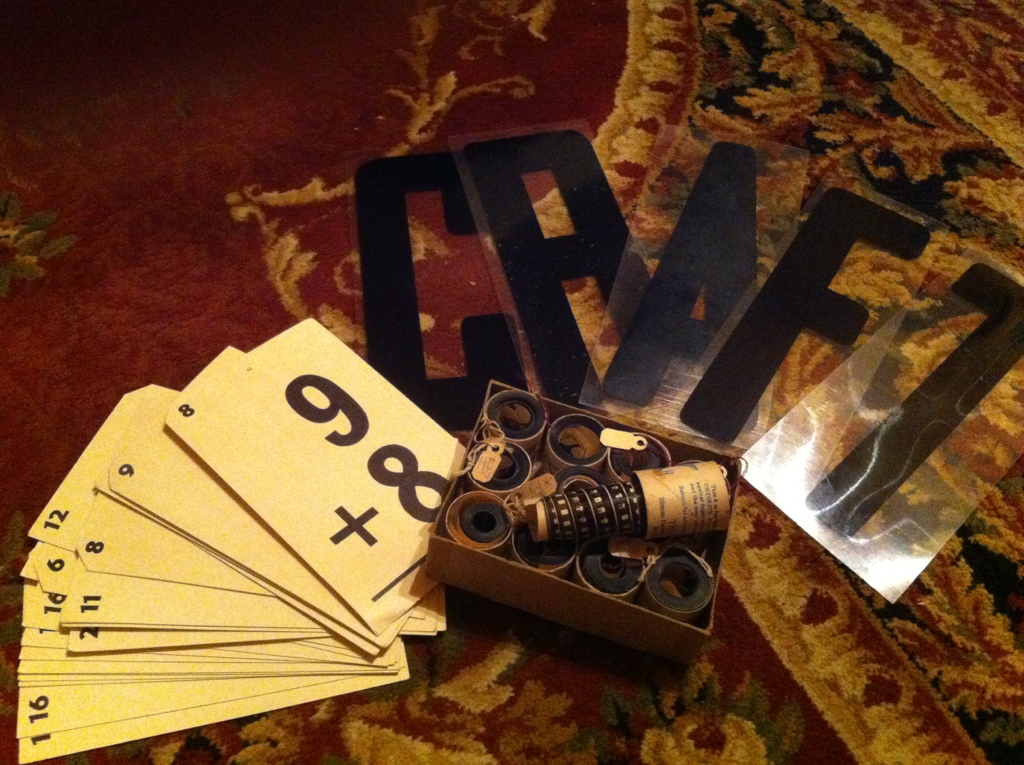 vintage flash cards… rolls of old film… and “craft” spelled out in old billboard letters (for my studio)…