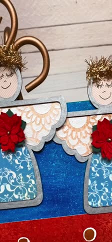 here’s a quick reel of a project i did for Clear Scraps. i used one of their rectangle wood shapes for the base. the angels are the outline pieces of the angel mini shaker. and the “rejoice” is a stencil; i used a gold texture paste to apply it. i used more stencils and texture paste to add designs to the printed papers used for the angels…