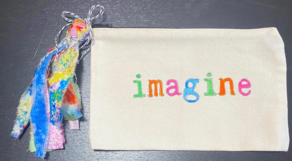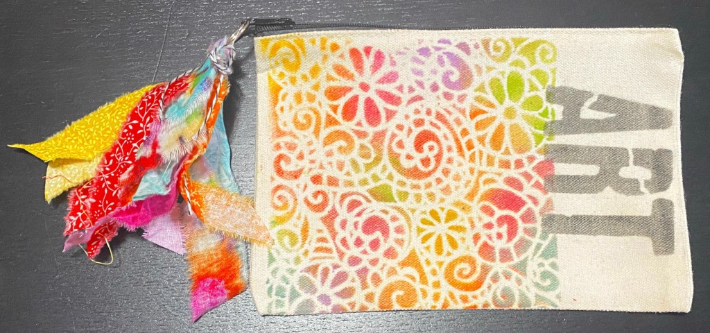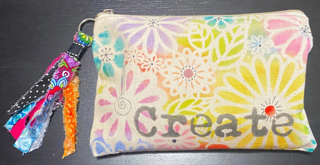 lately, i’ve been making canvas bags for friends at special crops or my students for classes. i say “make”, but it’s actually embelllishing. i purchased the bags; they were very reasonably priced and nice zipper canvas bags. canvas bags come in a variety of sizes, but i’ve been using those that are approximately 6 X 8. this makes a great size for organizing you pens and tools. since most crafters could use bags like this, it makes a great inexpensive gift – that just requires some time and products you probably have on hand…