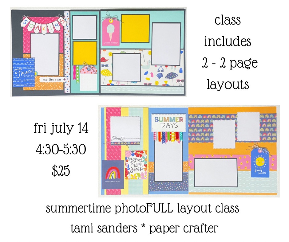 this class includes 2-2 page photoFULL layouts. we will make one in class and you’ll make the other one on your own. all pieces are precut and class includes printed directions complete with photos.